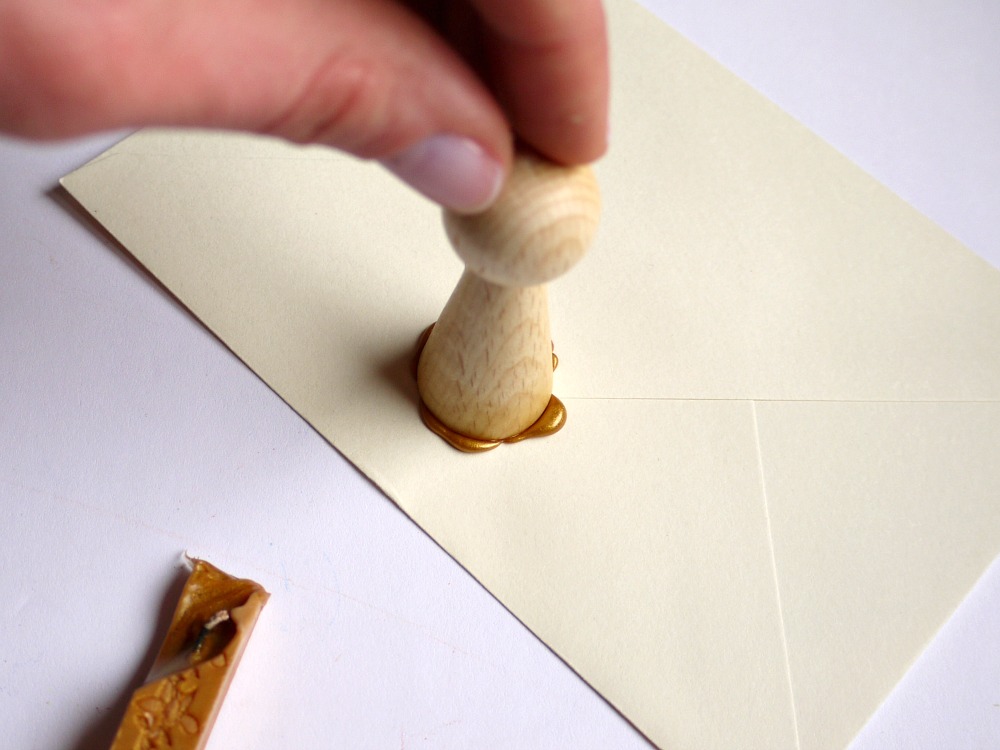 Motiv premažite z rastlinskim oljem, da se vosek ne bo prijel na les, segrejte pečatni vosek in odtisnite vaš pečat.