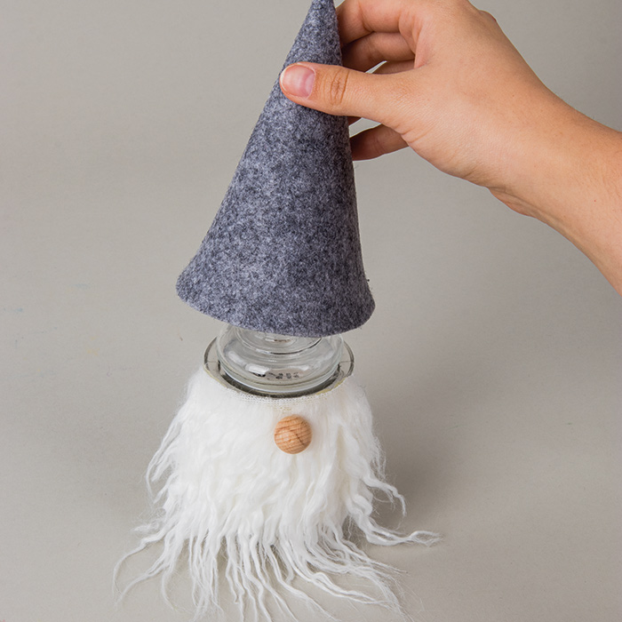 Z obojestranskim lepilnim trakom zlepite filc skupaj, da nastane koničast klobuk, ki se prilega stekleni posodici.