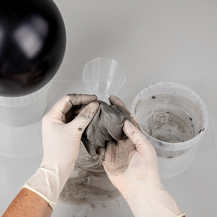 Za naslednji korak uporabite rokavice za enkratno uporabo. Zmešajte približno 250 g kreativnega betona 5 v 1 s približno 35 ml vode. Med mešanjem počasi, po malem, med nenehnim gnetenjem dodajamo vodo. Krhko zmes hitro gnetemo, najbolje na površini (npr. stabilni površini), dokler ne nastane masa, ki se lahko oblikuje.