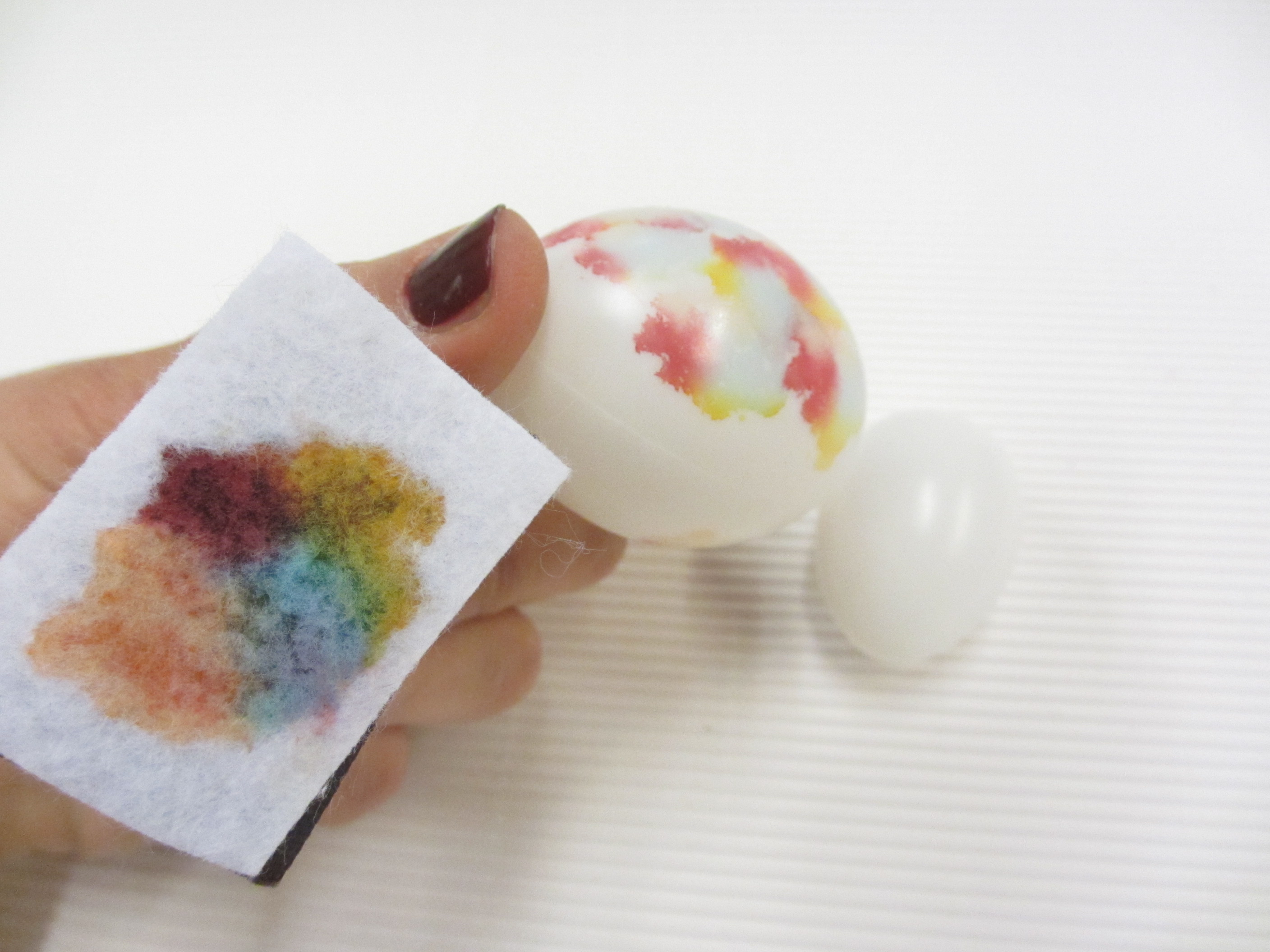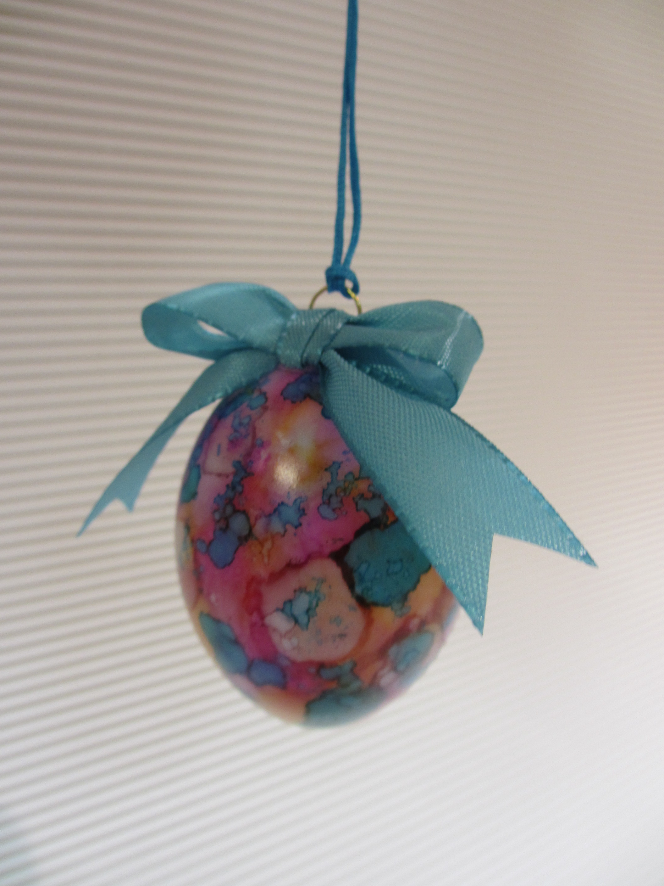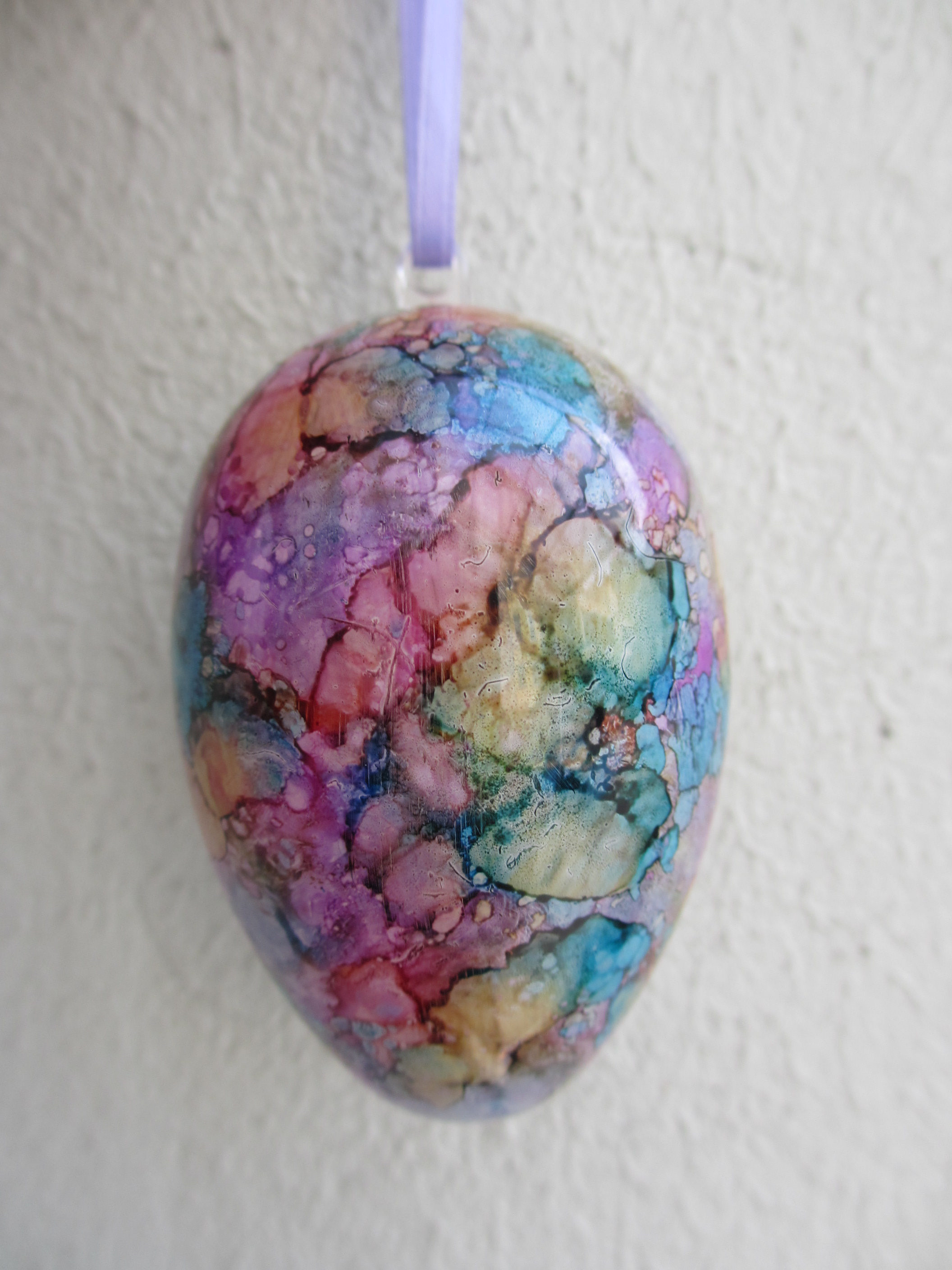 ....in potapkamo po površini jajca. Ker alkohol hitro hlapi, je površina suha v nekaj sekundah. Na površini se barve med seboj lepo prelivajo.