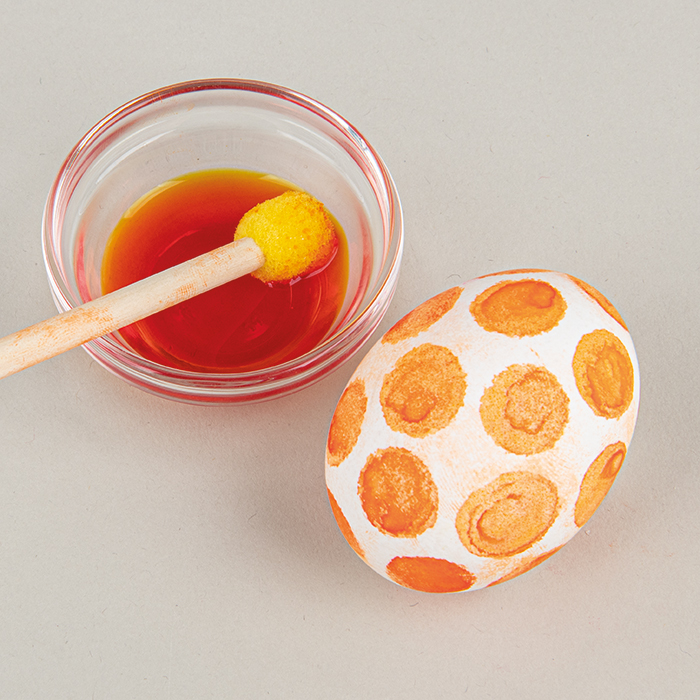 Barvo zmešajte bolj intenzivno (koncentrirano, z manj vode kot običajno), da dosežete lep in močan rezultat. Z majhnim gobastim čopičem poberite barvo in previdno naredite pike (pustite, da se pike posušijo, preden obrnete jajce).