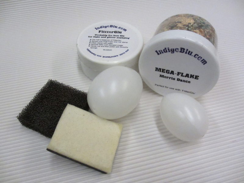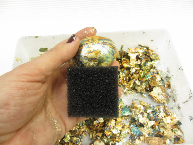 Za izdelavo potrebujemo: plastična jajčka, lepilo Flitter Glu, lističe za pozlato Mega Flakes, gobico za nanos lepila, polirno gobico za lističeNa gobico velikosti 3×4 cm nanesemo za čajno žličko lepila FlitterGlu in ga dobro vtremo v gobico.
