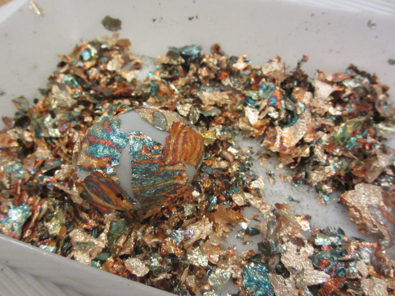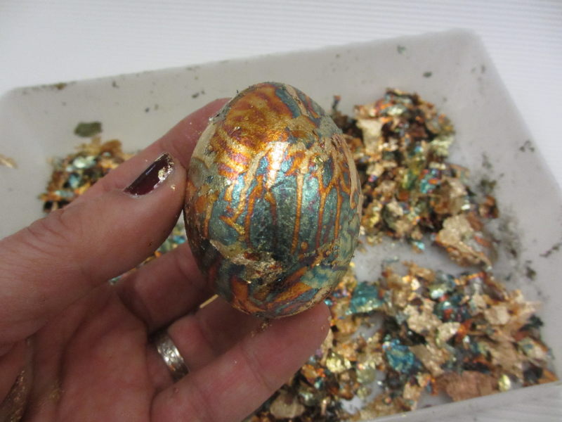Lističe za pozlato stresemo v večjo posodo in jajce povaljamo v njih.