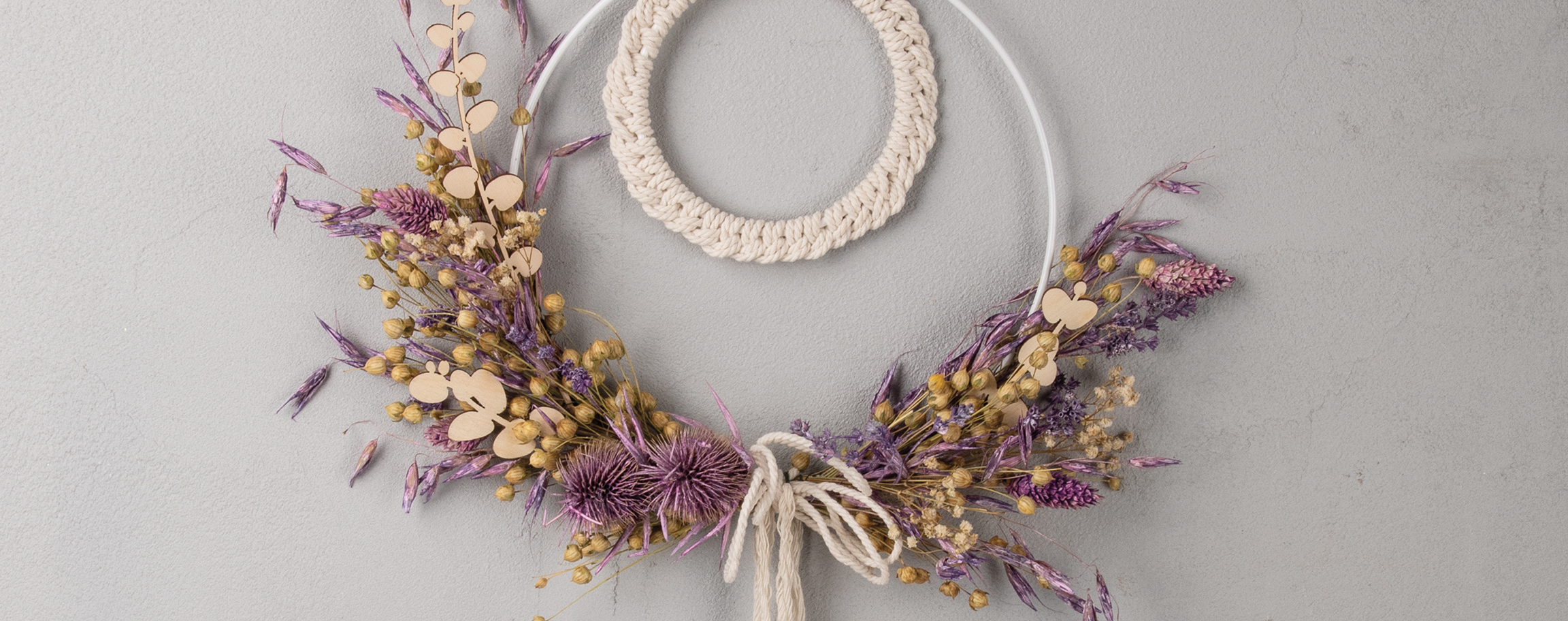 Obesite macramé obroč v obroč iz suhega cvetja tako, da naredite viseči vozel okoli obeh obročev. Preostanek vrvice uporabite za obešanje stenske dekoracije: leseno kroglico potegnite skozi in na koncu vrvice zavežite vozel.