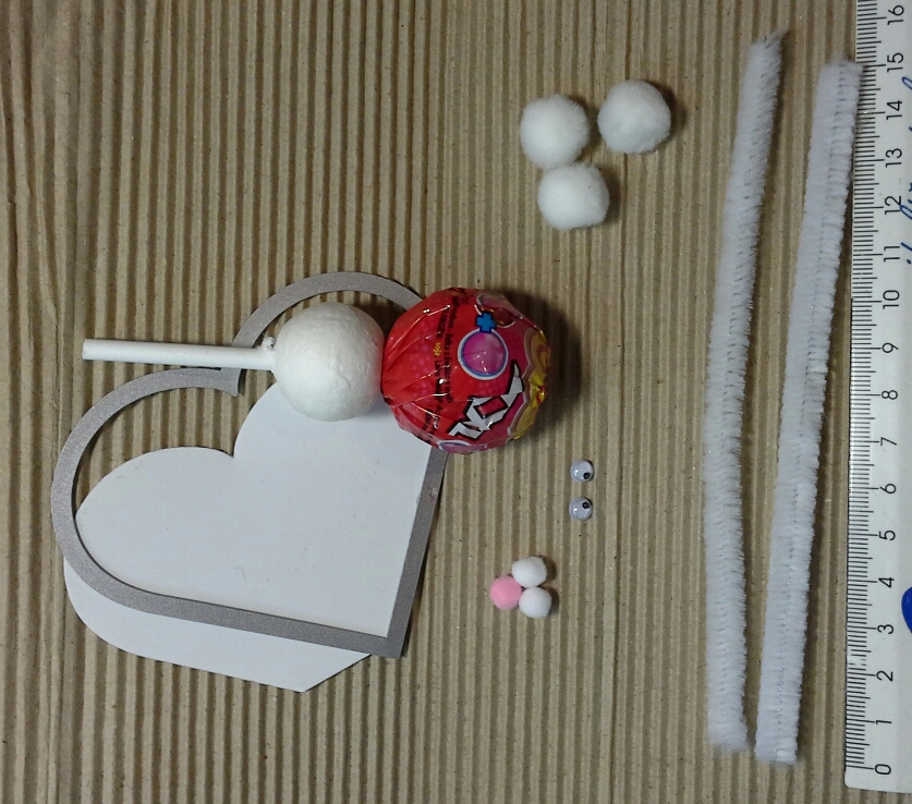 Necessitiamo: lecca-lecca formato XXL, pallina di cotone, pom pom bianchi e rosa, occhi di plastica, filo di ciniglia bianco e un pezzo di pellicola termoretraibile.Mettiamo una pallina di cotone sulla steccha del lecca-lecca, non abbiamo bisogno di incollarla.