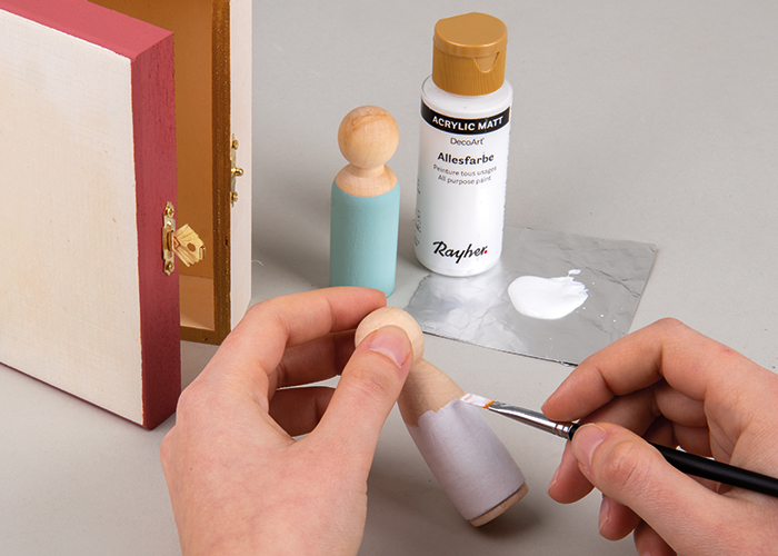 Korak 1Najprej pobarvajte posamezne elemente: z Rayherjevo akrilno barvo obarvajte rob pokrova lesene škatle opečnato rdeče, notranje robove pa zlato s kovinsko barvo. Za figure jaslic, stožec za Marijo z bolj žensko obliko, pobarvajte z belo barvo, stožec za Jožefa pobarvajte z limonasto zeleno barvo, stožec za majhno figuro, dojenčka Jezusa, pa pobarvajte zlato. Z zlato, belo, opečnato rdečo in limonasto zeleno barvo pobarvajte tudi lesene okrasne zvezde.
