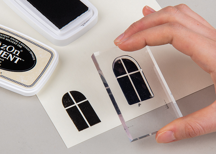 S prozornimi štampiljkami in črno blazinico za štampiljke StazOn odtisnite dve okni na bel ali svetlo bež papir. Za oblikovanje notranjosti pokrova lahko na primer izrežete (natisnete) notni list. (Priporočamo glasbeni list z božično pesmijo, npr. Tiha noč).
