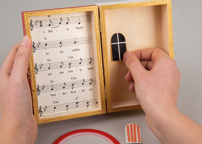 Nato izrežite okna in jih z obojestranskim lepilnim trakom skupaj z izrezanim glasbenim listom prilepite v škatlo.