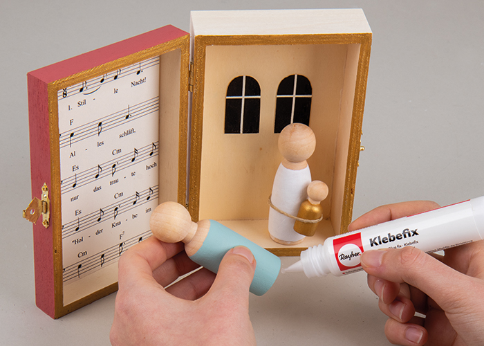 Ko se vse pobarvane površine posušijo, lahko zlati stožec Jezusa z nitjo iz jute, ki je priložena lesenim zvezdicam, privežete na belo pobarvano leseno figuro Marije. Z malo lepila pritrdite vse figure v škatlo in prilepite pobarvane zvezde na pokrov.
