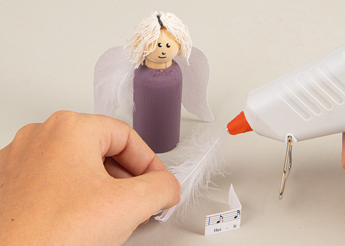 Zdaj angelčkom prilepite krila, za šal jim dodajte kosmato žičko bele barve, notni list in okrasna peresa ter postavite zbor angelčkov na leseni disk.