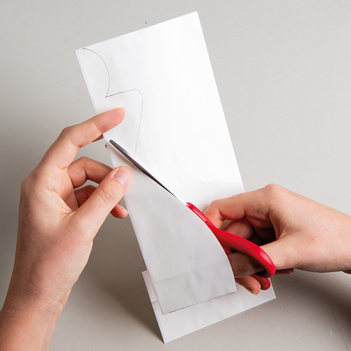 Izreži obris angela s škarjami. Za velikega angela potrebuješ 15 izrezov iz 15 papirnatih vrečk (1 izrez na vrečko), za malega angela pa 12 izrezov iz 6 papirnatih vrečk (2 izreza na vrečko).