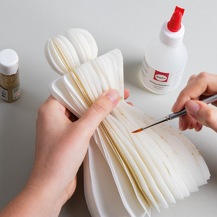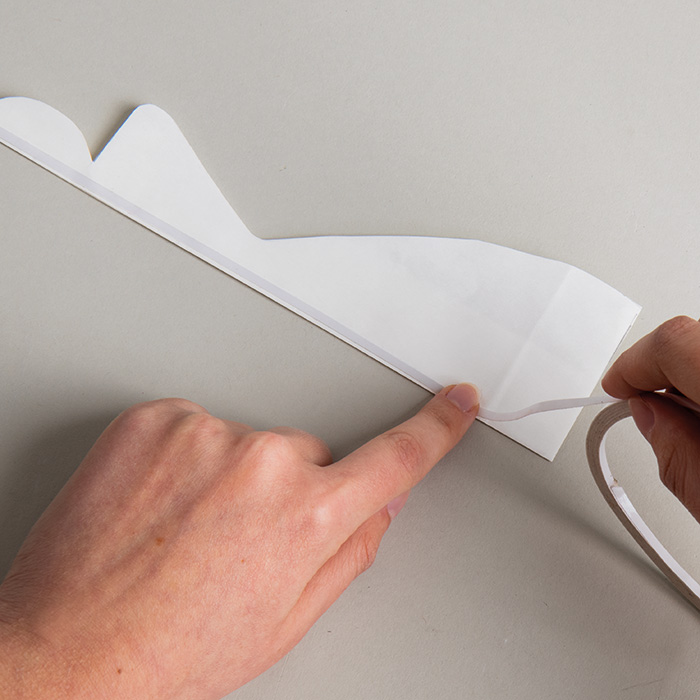 Ob dolgem robu nanesi obojestranski lepilni trak na rob pri 14 izrezih (za velikega angela) in 11 izrezih (za malega angela).