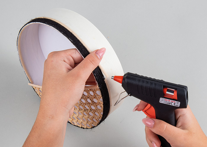 Črno vrvico odvijte v širini 1,5 cm okoli zunanjega zgornjega roba in jo pritrdite z vročim lepilom.