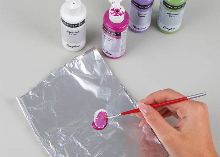 1. korakAkrilne barve fuksija, sivka in avokado vsako posebej zmešaj z belo, da dobiš pastelne odtenke.