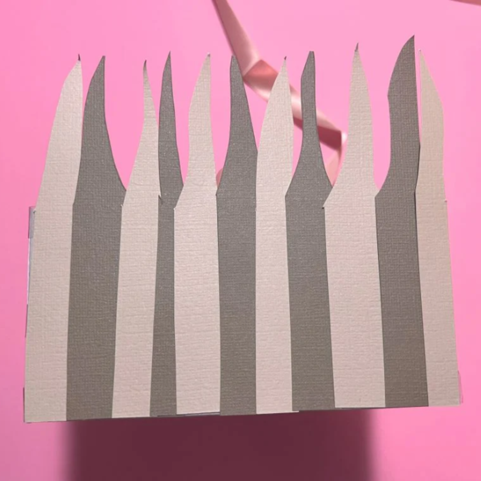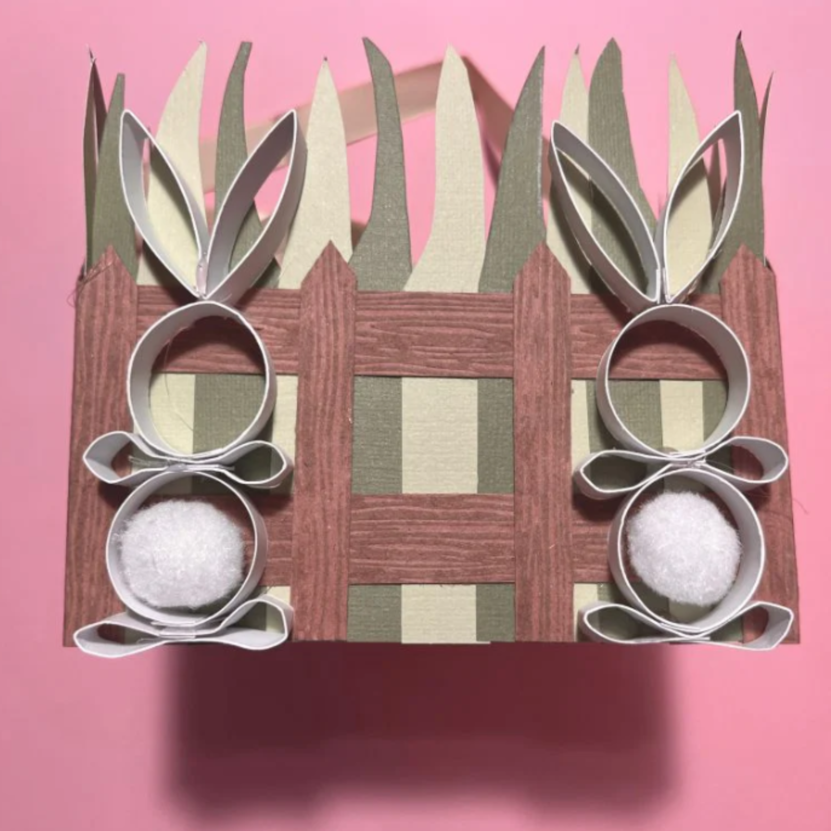 Iz vtisnjenega kartona izrežite 8 trakov velikosti 1,9 cm x 15 cm in jih nalepite vodoravno čez travo – enega na sredino in enega blizu dna košarice.