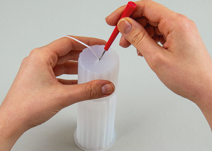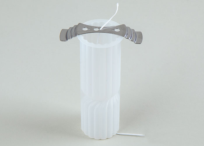 Appoggia il supporto metallico per stoppini sull’apertura dello stampo e fissa l’altra estremità dello stoppino nel foro del supporto.