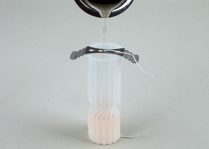 Consiglio: per una candela colorata mescola il pigmento nella cera fusa. Versa con attenzione la cera liquida nello stampo. Puoi riempire lo stampo a diverse altezze.