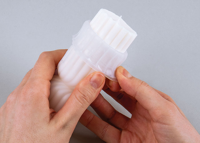 Lascia raffreddare bene – durante il raffreddamento può formarsi un avvallamento che puoi colmare con altra cera. Lascia solidificare completamente. Poi rimuovi il supporto e sfila delicatamente lo stampo in silicone.