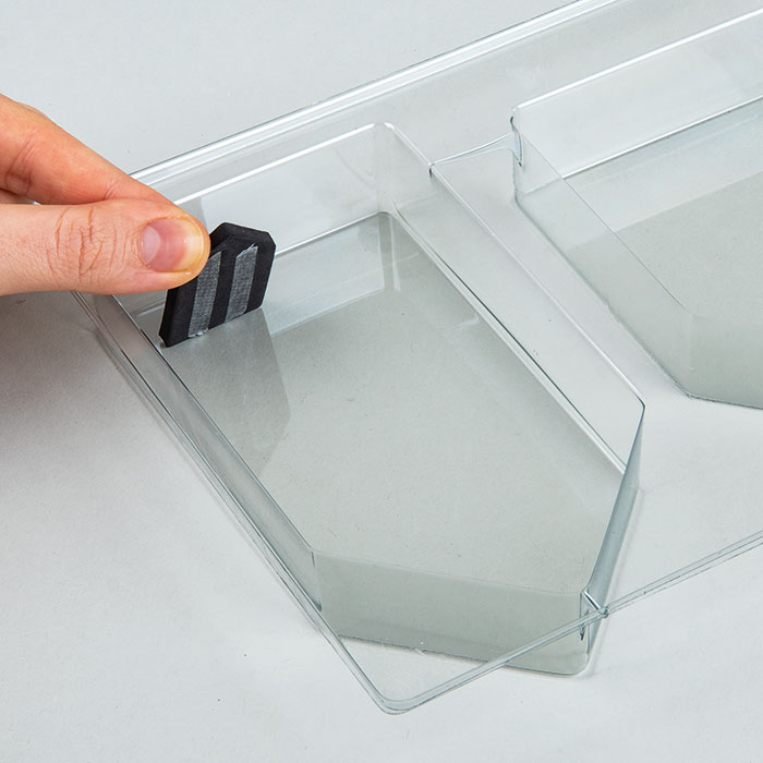 Korak 1Pred vlivanjem pripravi kalup tako, da vanj namestiš vložek »Nupsi«. Na eno stran vložka prilepi kos obojestranskega lepilnega traku, odstrani zaščitno folijo in vložek postavi na spodnji del kalupa. Pusti razdaljo vsaj 1 cm od spodnjega roba.