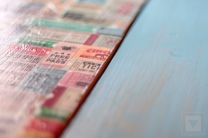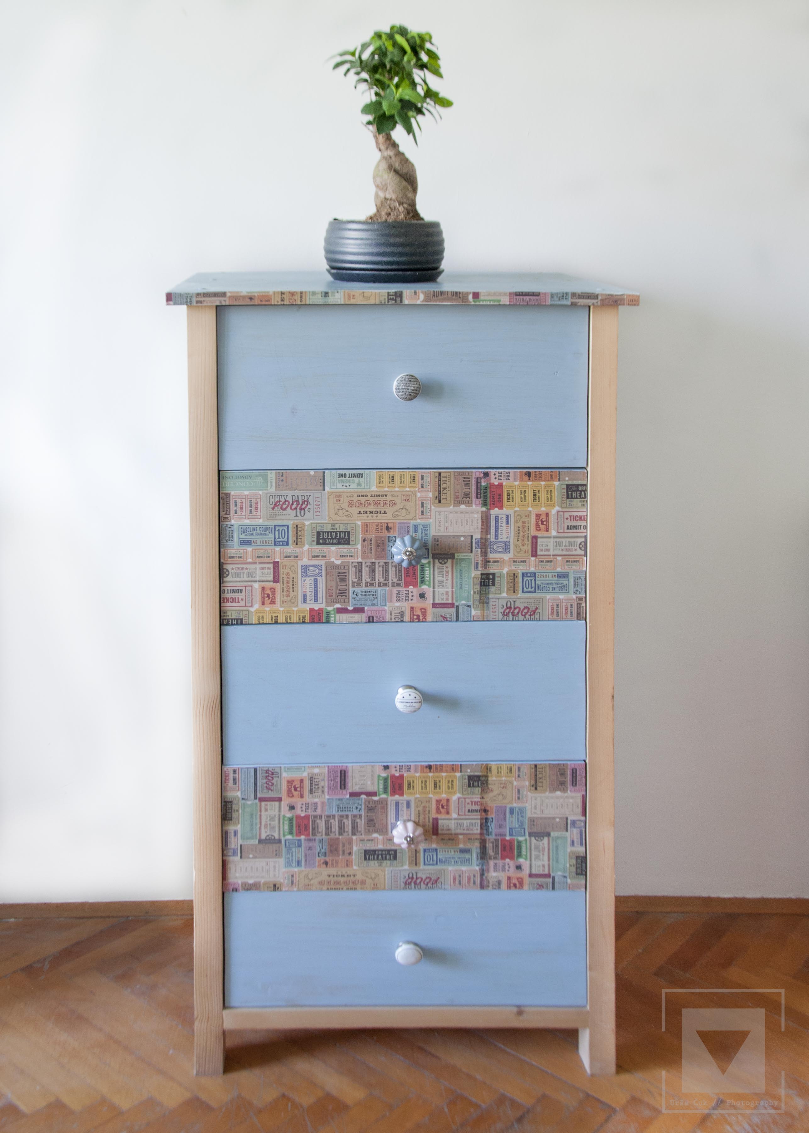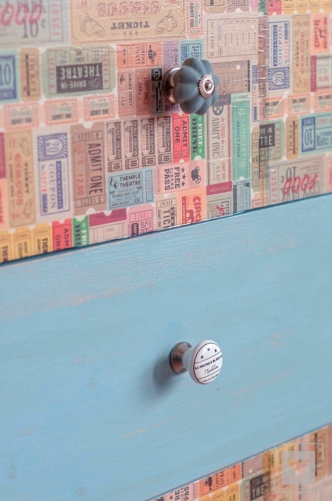 Ko je barva suha, začnemo z lepljenjem decoupage papirja na predale, pobarvane z belo akrilno barvo in brušenjem predalov, pobarvanih z barvo Chalky Finish.