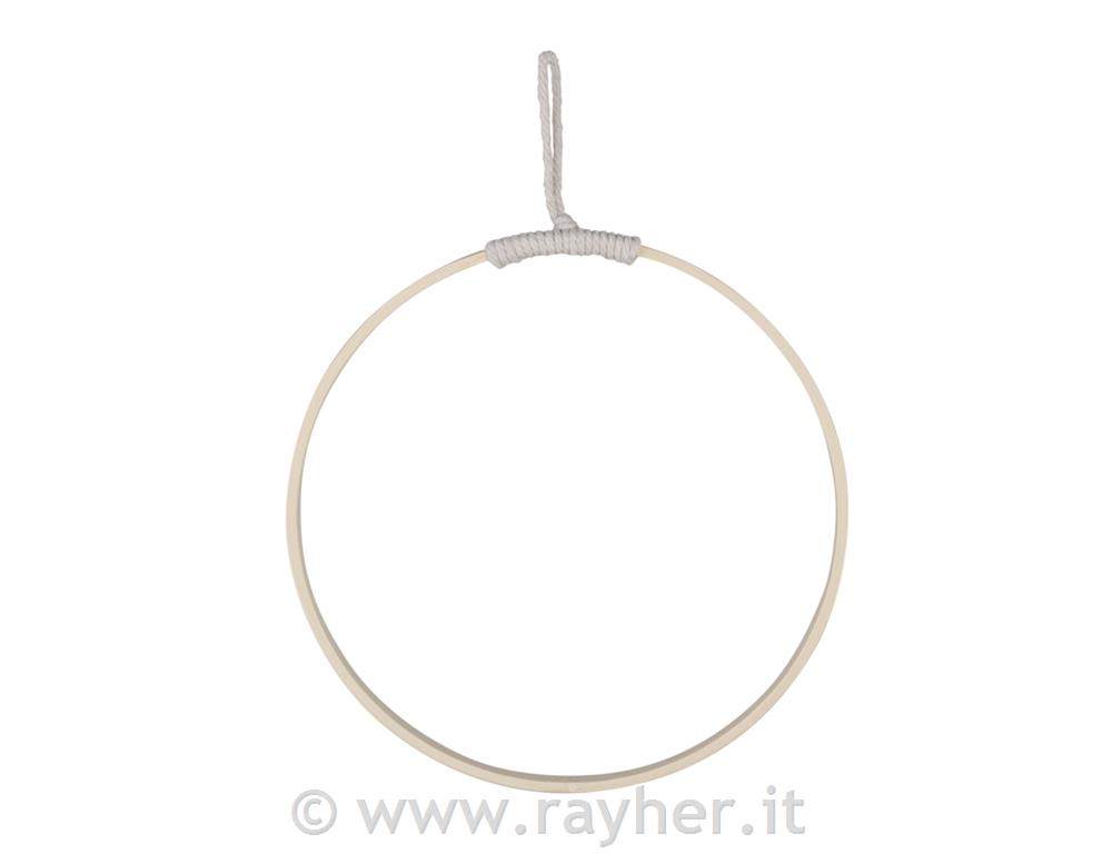 Makrame vrvico pritrdi z eno kapljico vročega lepila približno 3 cm stran od obstoječega obešalnega traku na bambusovem obroču in jo enakomerno ovij okoli obroča v dolžini približno 3 cm. Odreži konec in ga ponovno pritrdi z vročim lepilom. Enako ponovi tudi na drugi strani.