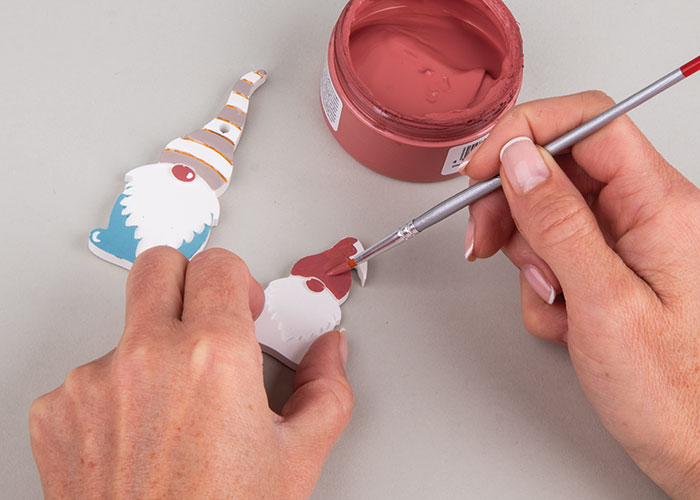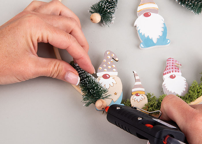 Dekorativne smrečice dodatno okrasi. Dve s pomočjo makrame vrvice obesi na obroč (pritrditev z vročim lepilom), tretjo pa pod kotom prilepi na velikega, pobarvanega škrata.