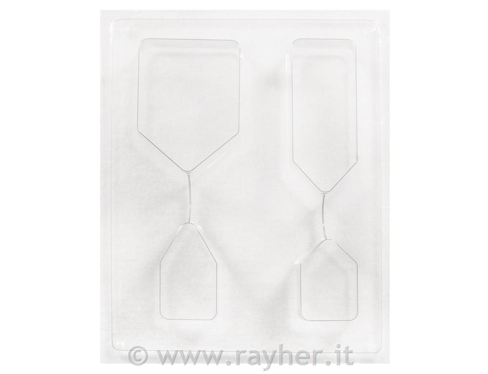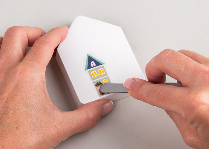 Prenesi izrezane motive enega za drugim na posušeno hiško. Najprej odstrani zaščitni papir, motiv postavi na želeno mesto in ga z nežnim drgnjenjem – na primer s topim koncem pincete – prenesi na površino. Nato odstrani zaščitno folijo.
