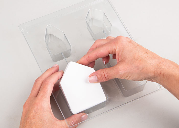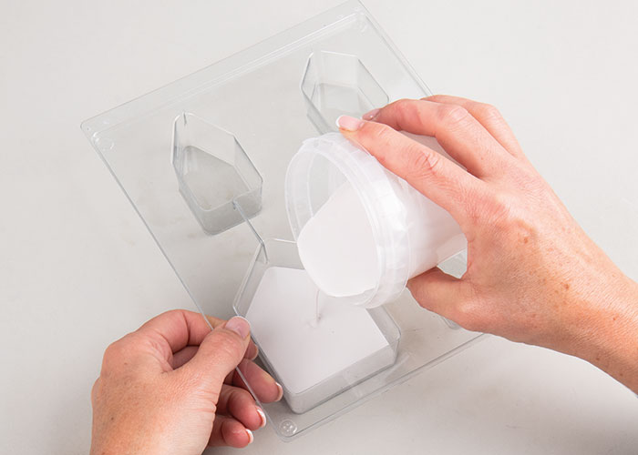 1. korakPripravi približno 150 g Raysina po navodilih na embalaži in zlij maso v silikonski kalup za hiške, da vliješ eno hiško.
