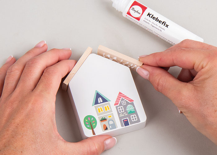 Za streho s Klebefix lepilom lepi dve leseni paličici na vrh hiške in pusti, da se dobro posuši.