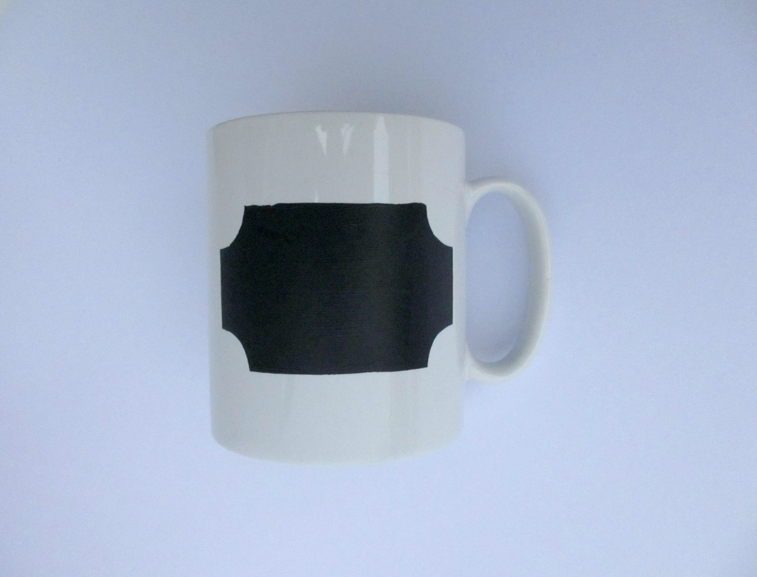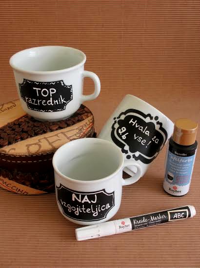 Črno površino table lahko naredimo tudi na izdelkih iz stekla, keramike in porcelana. Okrasimo dolgočasno belo skodelico ali pa preobrazimo kakšno od skodelic, ki ima reklamni potisk.Potrebujemo: