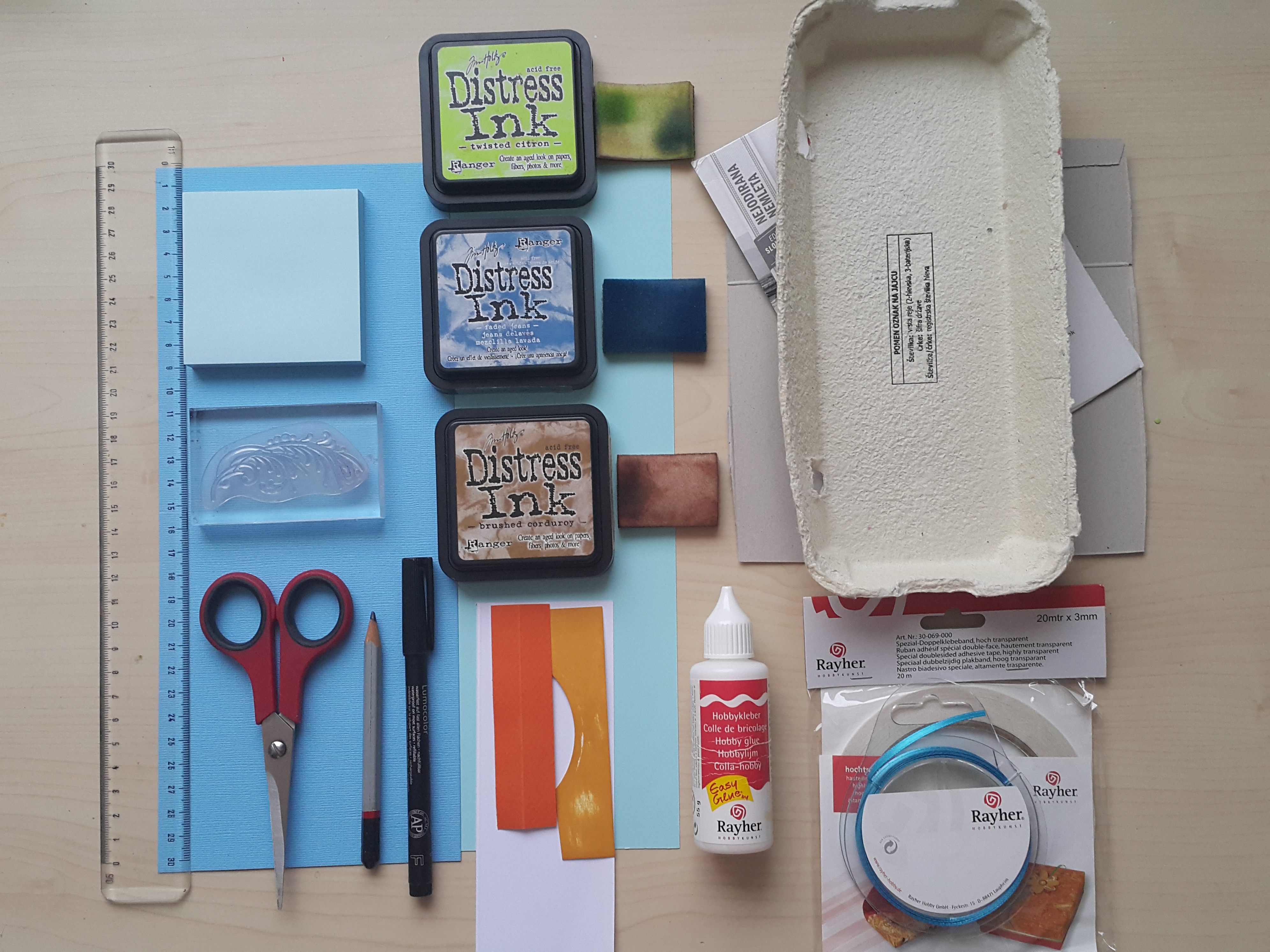 - Distress Ink blazinice – Twisted citron, Brushed corduroy, Faded jeans,