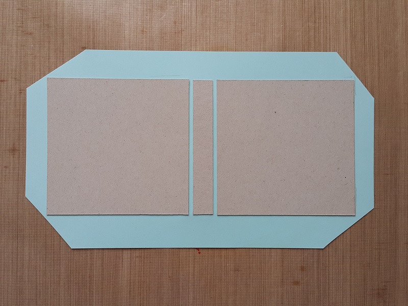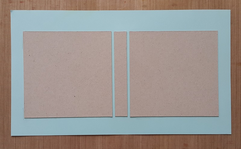 Vse tri dele (platnici in hrbet) z obojestranskim lepilnim trakom nalepimo na tonpapir v mint barvi, ki mora biti na vsaki strani vsaj za 1 cm večji od platnic. Pazimo na razmika med platnicama in hrbtom.
