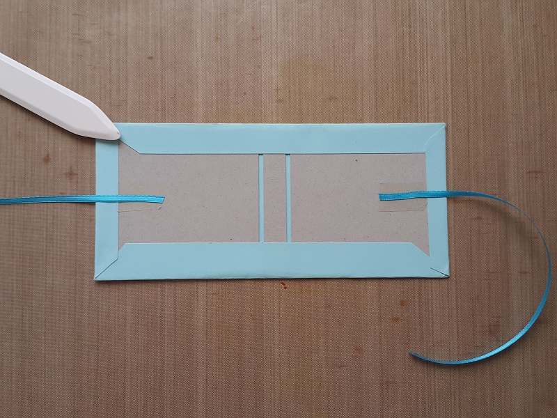 Tonpapir zapognemo na vseh štirih stranicah in zalepimo v zaporedju – najprej nasprotni daljši stranici, nato nasprotni krajši. Za lepe pregibe si pomagamo s kostjo.
