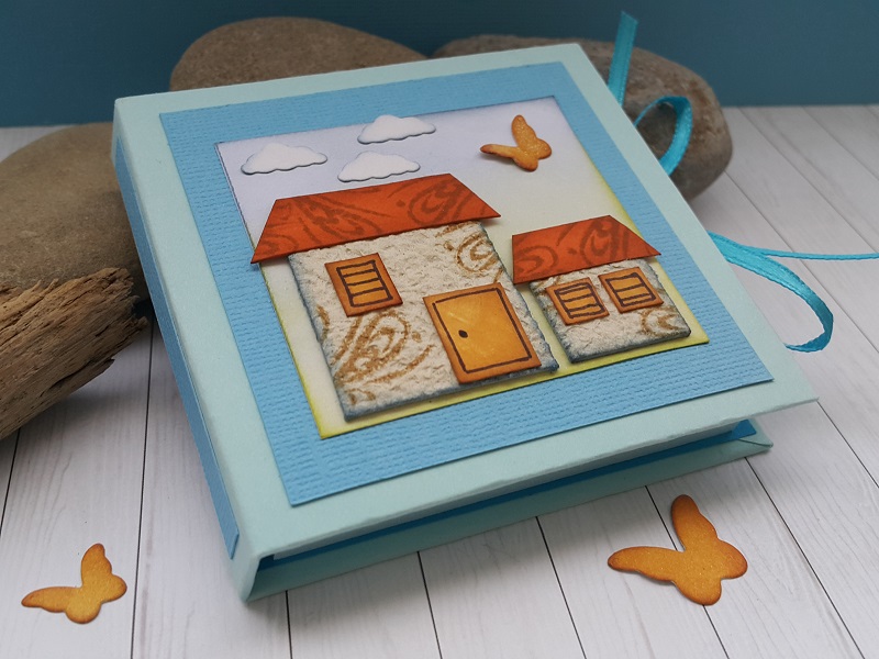 Iz papirja s teksturo izrežemo dele za zunanjo stran platnic in hrbta. Bel tonpapir osenčimo z modro in zeleno blazinico (Distress ink). Iz embalaže od jajc izstrižemo dve kamniti hišici (tekstura papirja spominja na kamen). Iz oranžnega papirja izstrižemo streho, okna in vrata in oktasimo s štampiljko z ornamenti in rjavo blazinico.