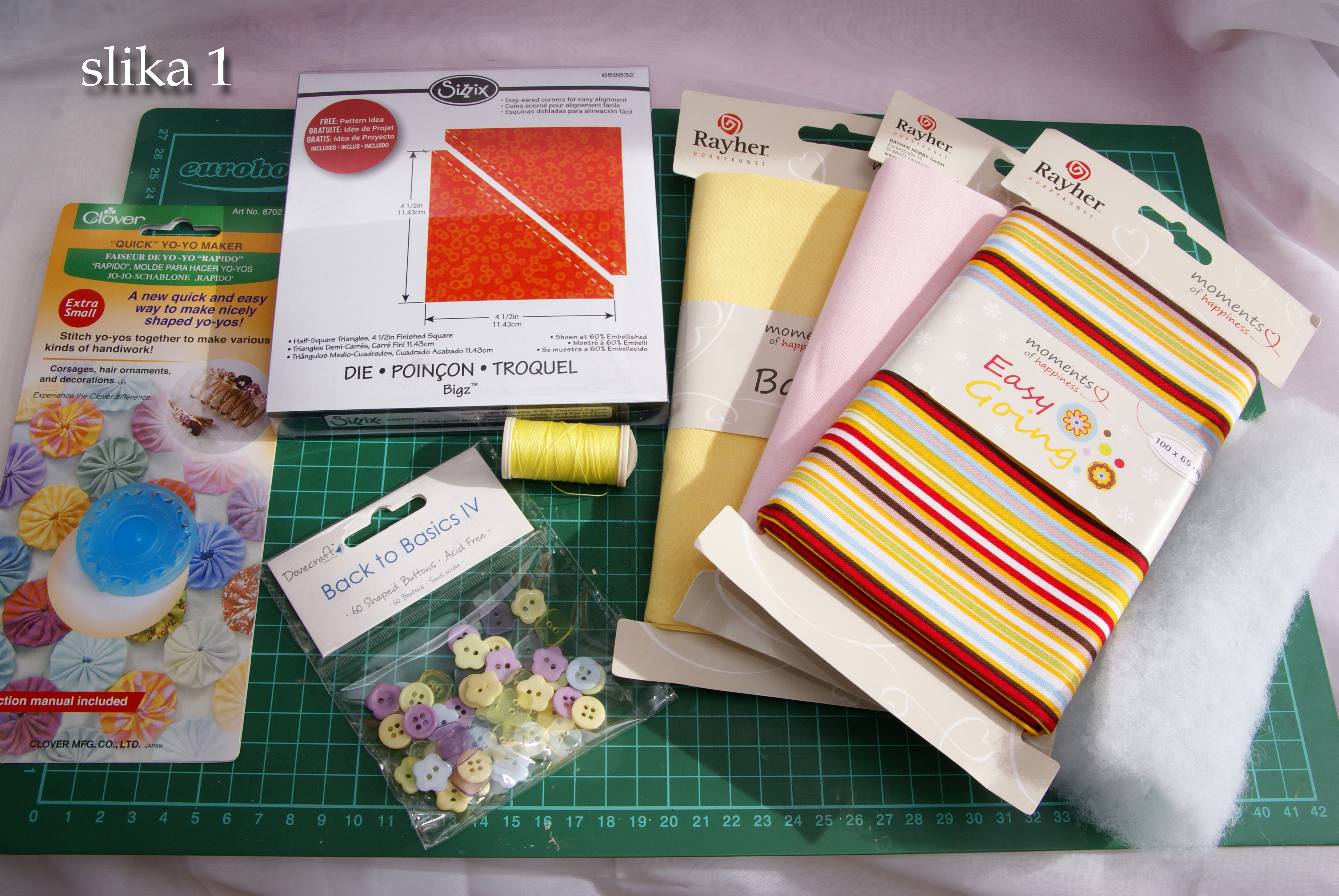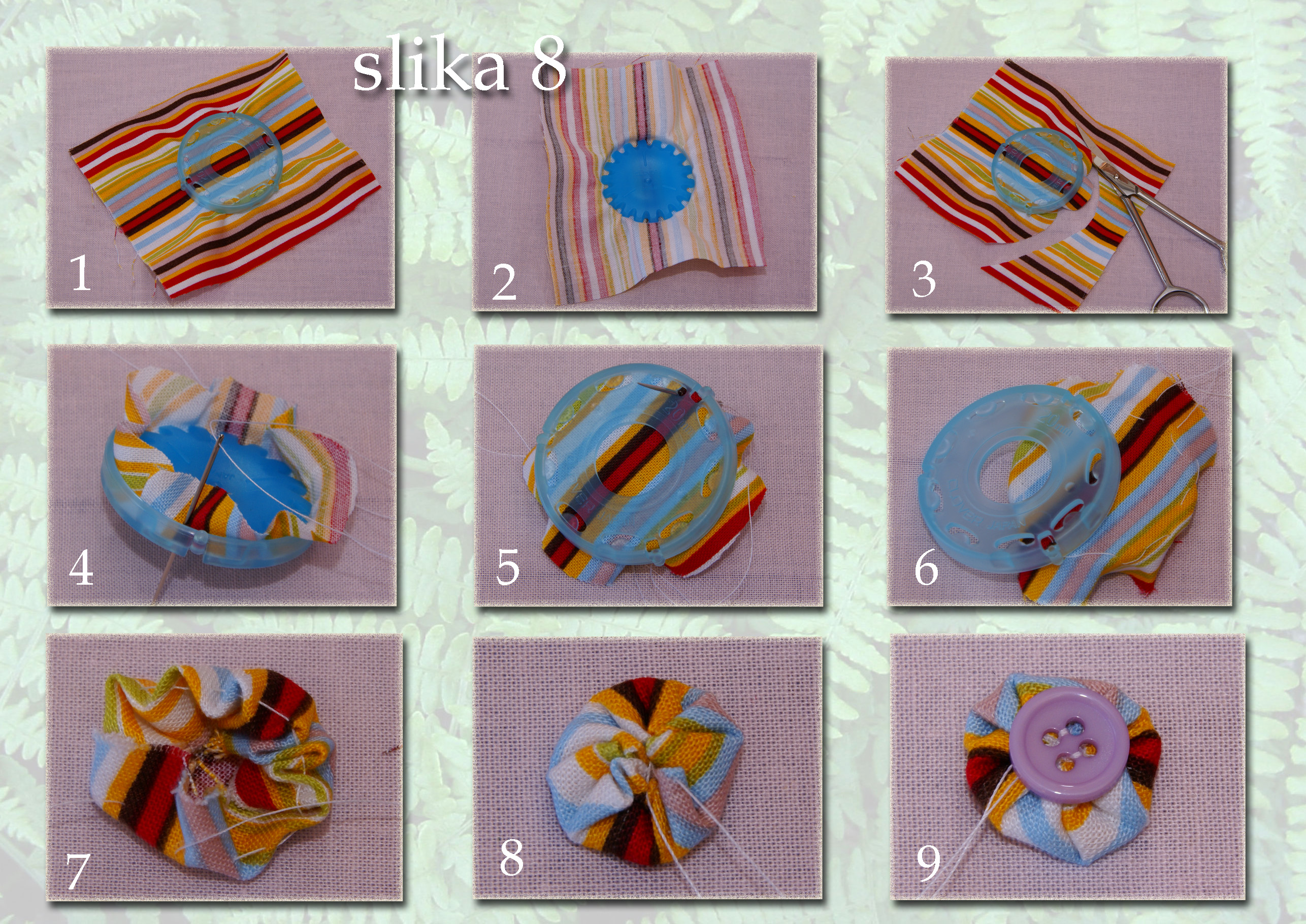 Iz črtastega blaga naredimo s pomočjo yo-yo makerja 12 mini rožic po postopku kot kaže slika. Na sredino vsake rožice prišijemo gumb za dekoracijo. Rožice prišijemo na pogrinjek.