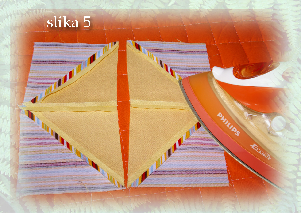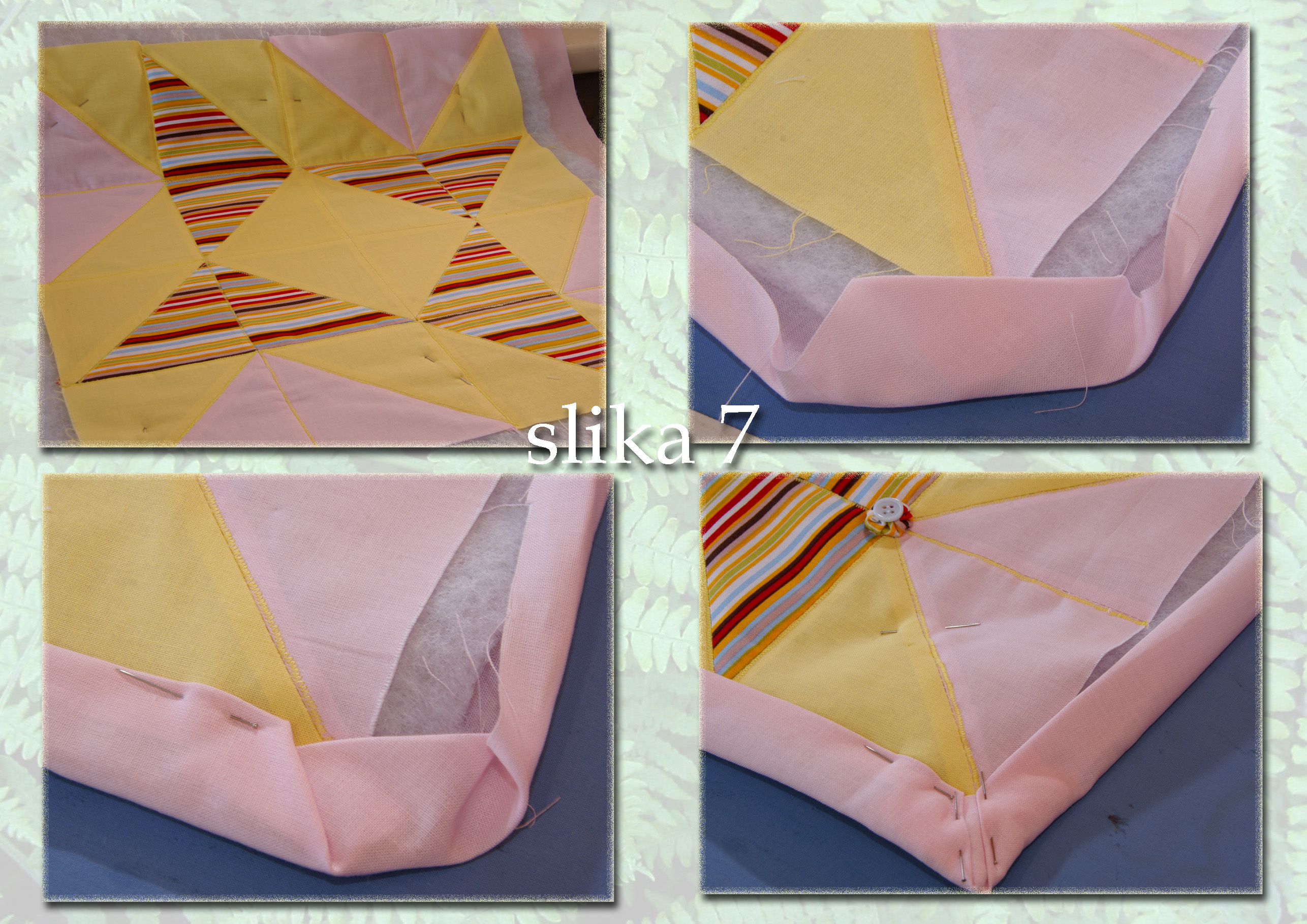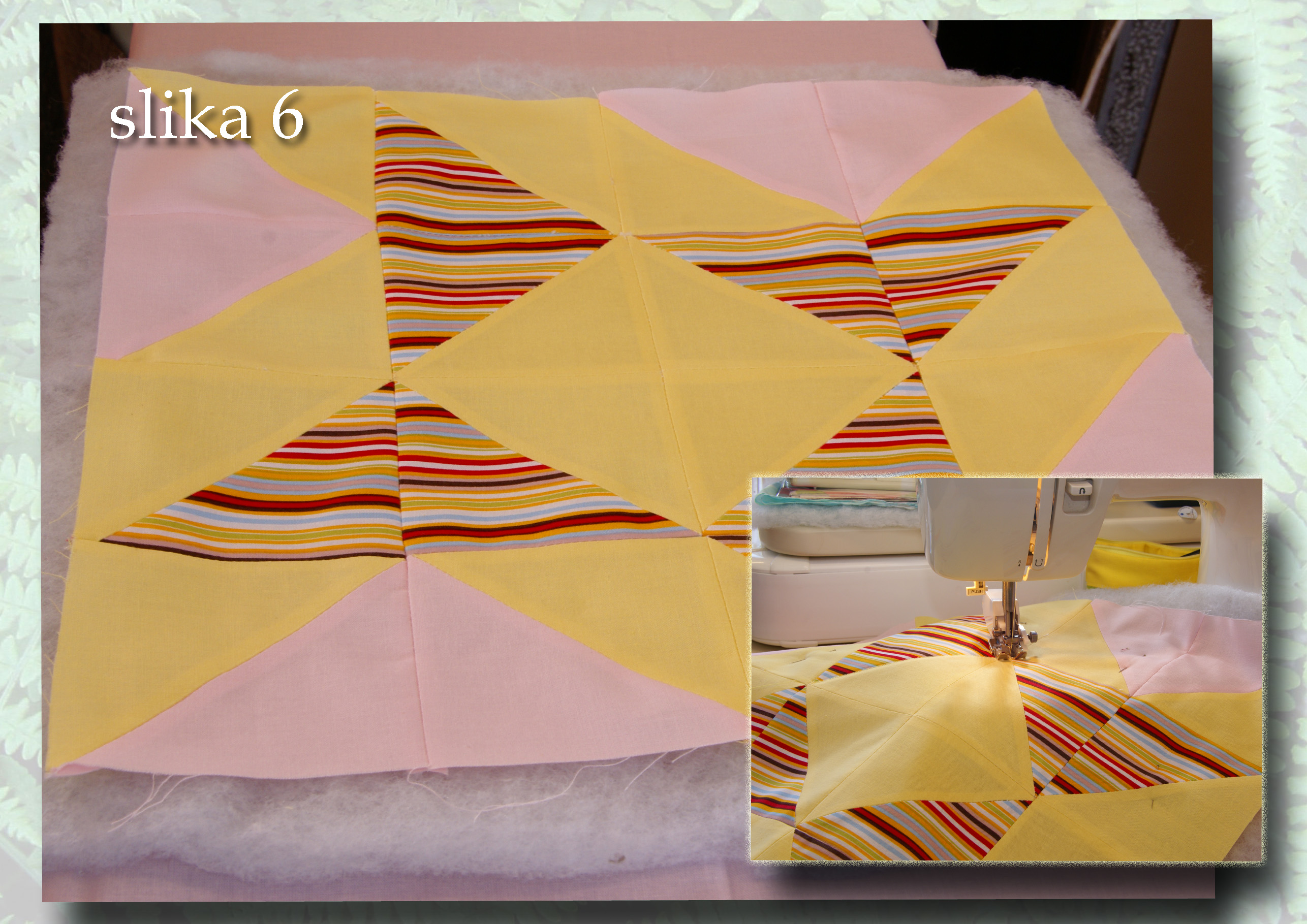 Vsakemu sešitemu delu na zadnji strani sproti razlikamo rob, tako bomo lažje šivali trikotnike in bo tudi zadnja stran izdelka lična čeprav ne bo vidna, saj bo celoten vzorec sešit skupaj s polnilom oz. medvlogo. Pri šivanju trikotnikov pazimo tudi, da šivamo robove točno, da se trikotniki v končnem izdelku lepo stikajo med seboj.