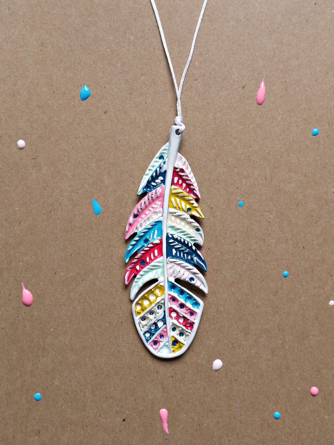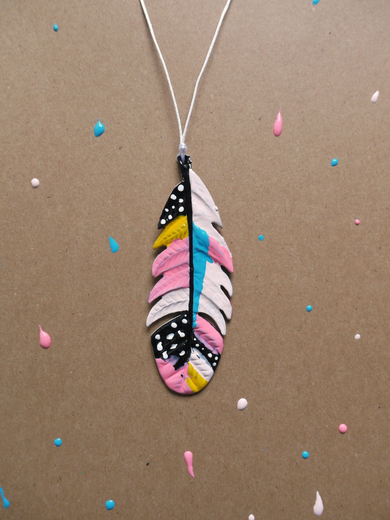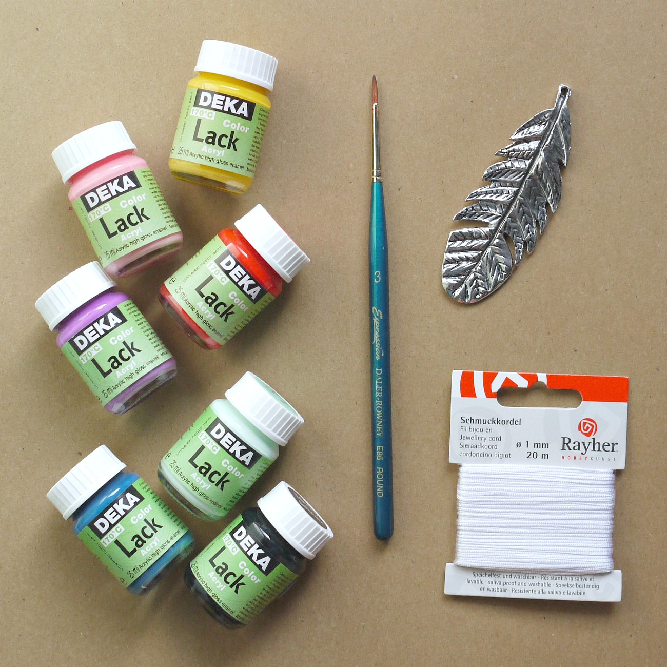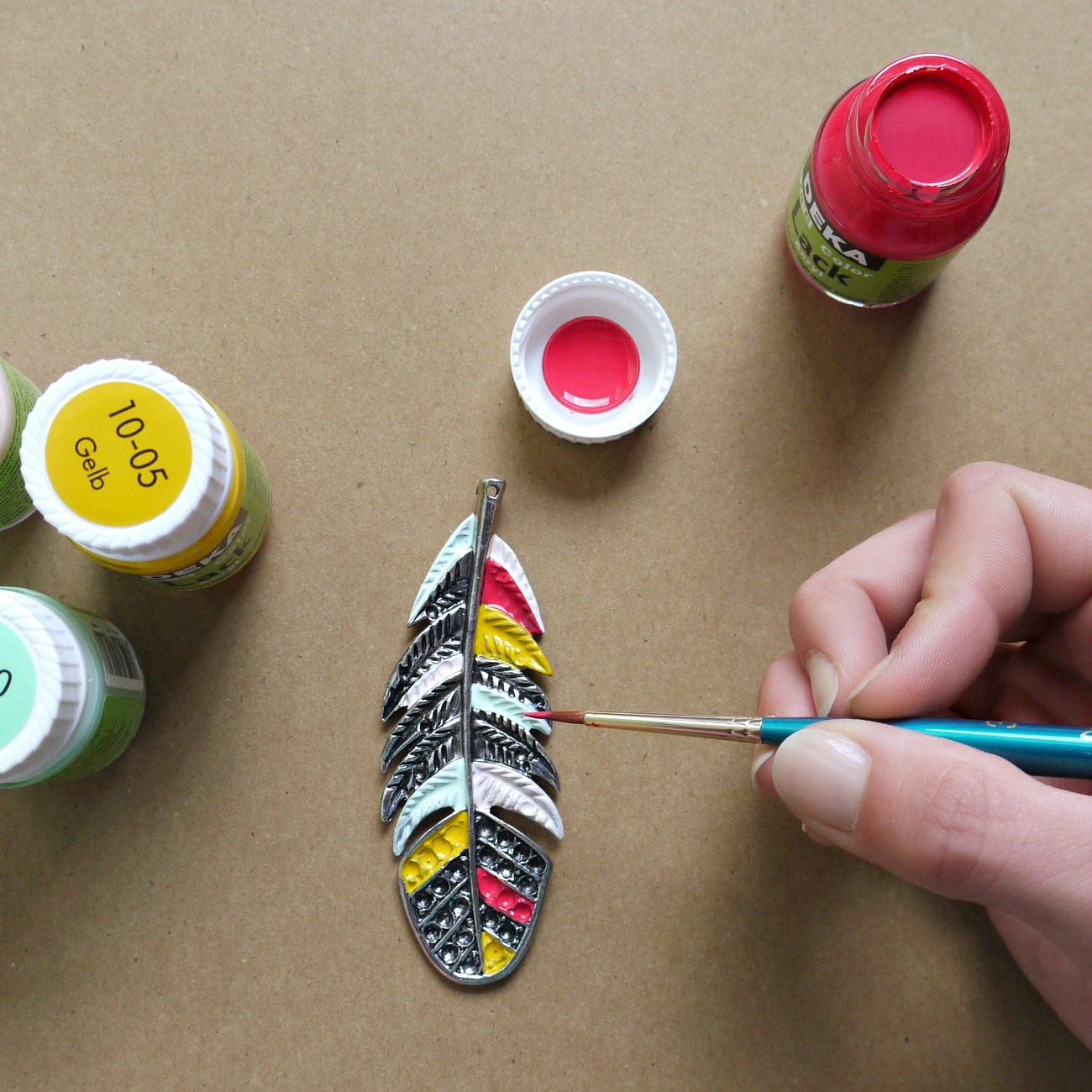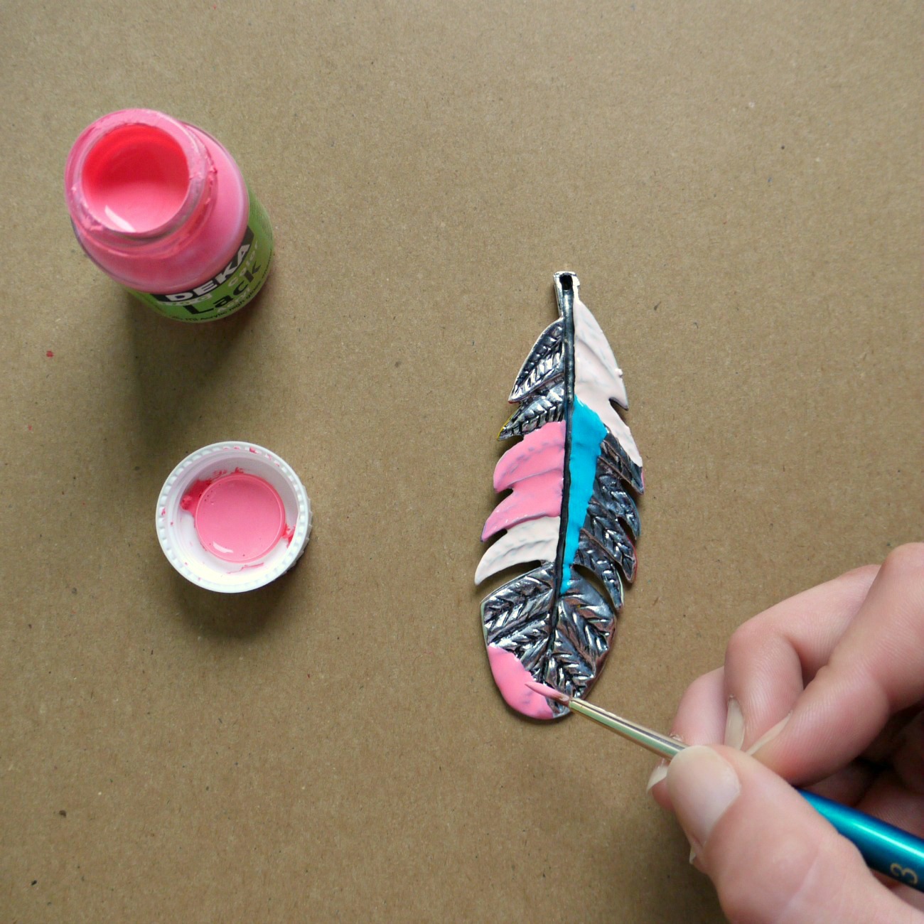 Navaden srebrni obesek v obliki peresa lahko za popestritev poletne garderobe pobarvamo z akrilnimi barvami. Potrebujemo: - kovinski obesek - Deka Lack barve - čopič - vrvico ali verižico. Obesek najprej po želji pobarvamo z akrilnimi barvami in počakamo da se posuši. Nato enostavno skozenj napeljemo vrvico in naš pisan modni dodatek je narejen.