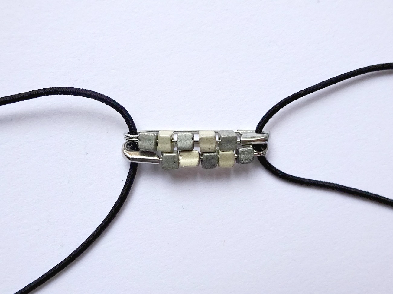 Dolžino elastične vrvice odrežemo glede na obseg zapestja. Sponke nanizamo na vrvici in sicer tako, da je vsaka druga sponka obrnjena okoli. Elastično vrvico enostavno zavozlamo.