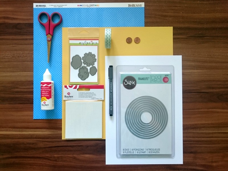 Tri manjše okrogle rezalne šablone pritrdimo z washi samolepilnim trakom kot kaže fotografija in izrežemo scrapbook karton z vzorcem pikic.
