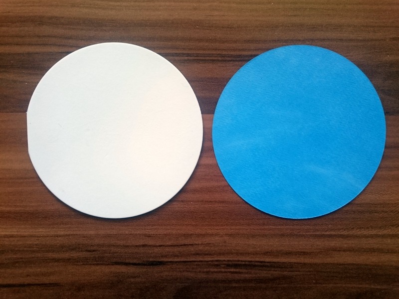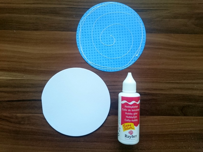 Z isto šablono izrežemo tudi krog iz scrapbook kartona in ga z lepilom za papir prilepimo na lice bele osnove.