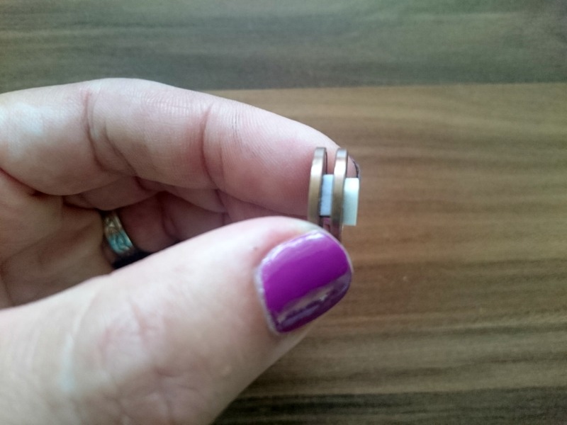 S koščkom penaste blazinice (2×2 mm) zalepimo skupaj dva kovanca. Enako velik košček prilepimo tudi na vrh enega od kovancev, nanj pa pritrdimo sonček.