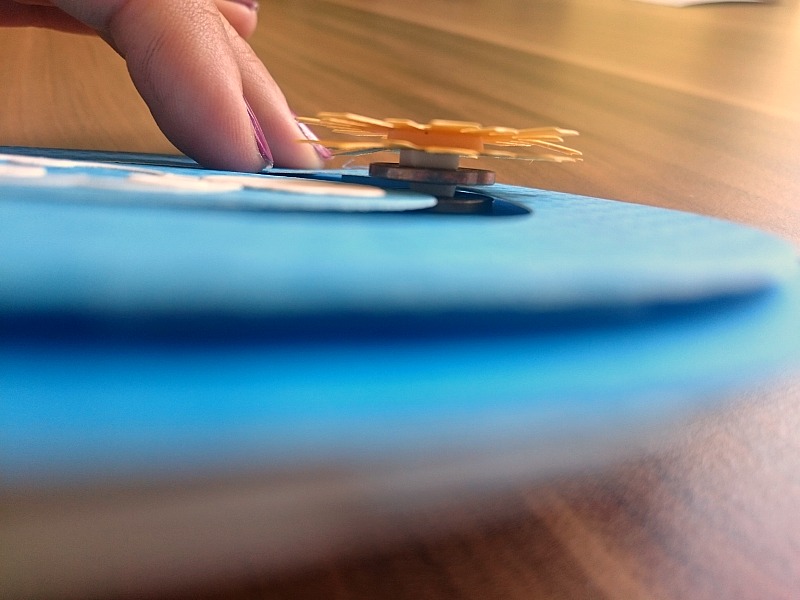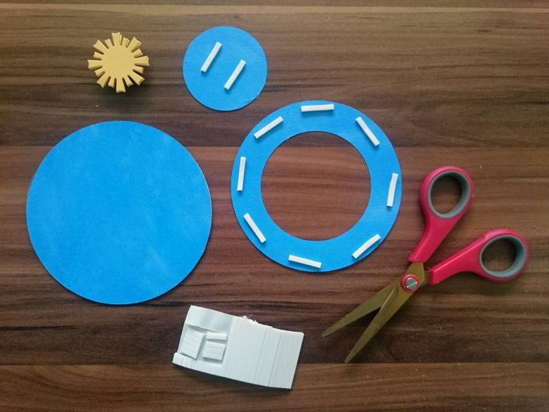 Vse izrezane dele scrapbook kartona sestavimo kot kaže fotografija, sonček na kovancih pa zataknemo v tirnico.