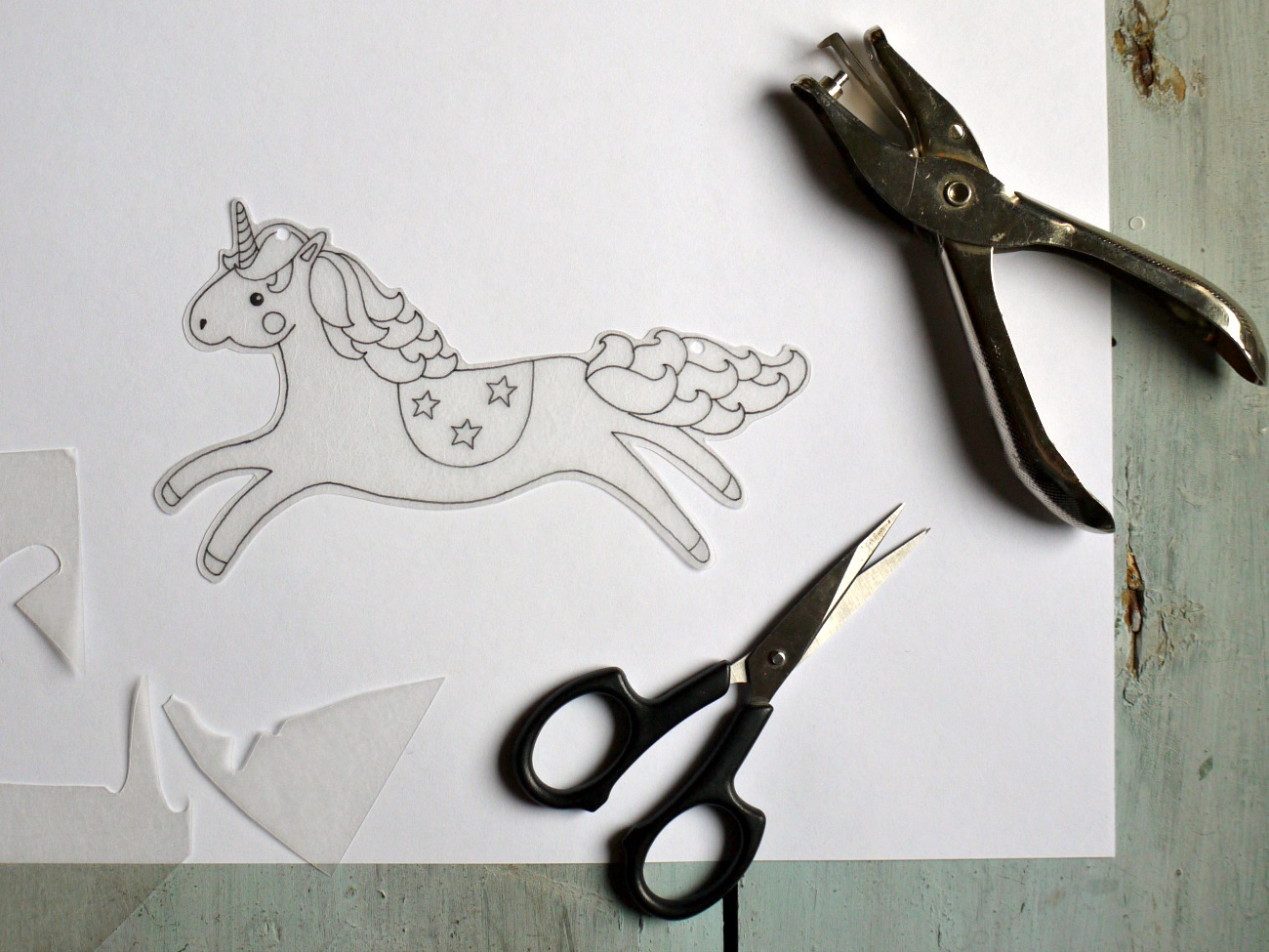 Motiv obrežemo s škarjami ali skalpelom 1mm od roba. Če izdelujemo obesek, z luknjačem naredimo luknjo.