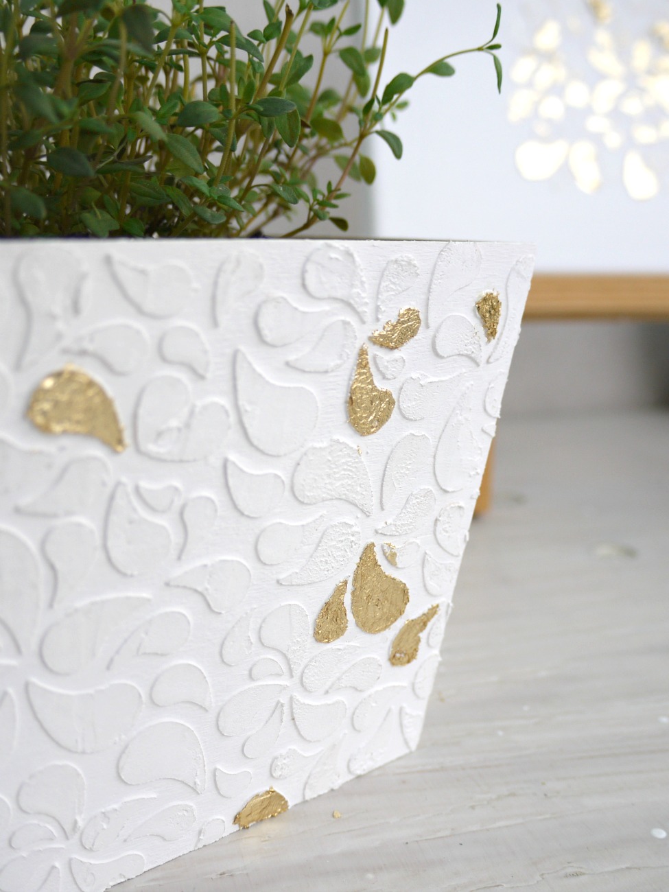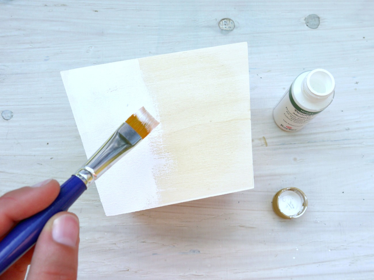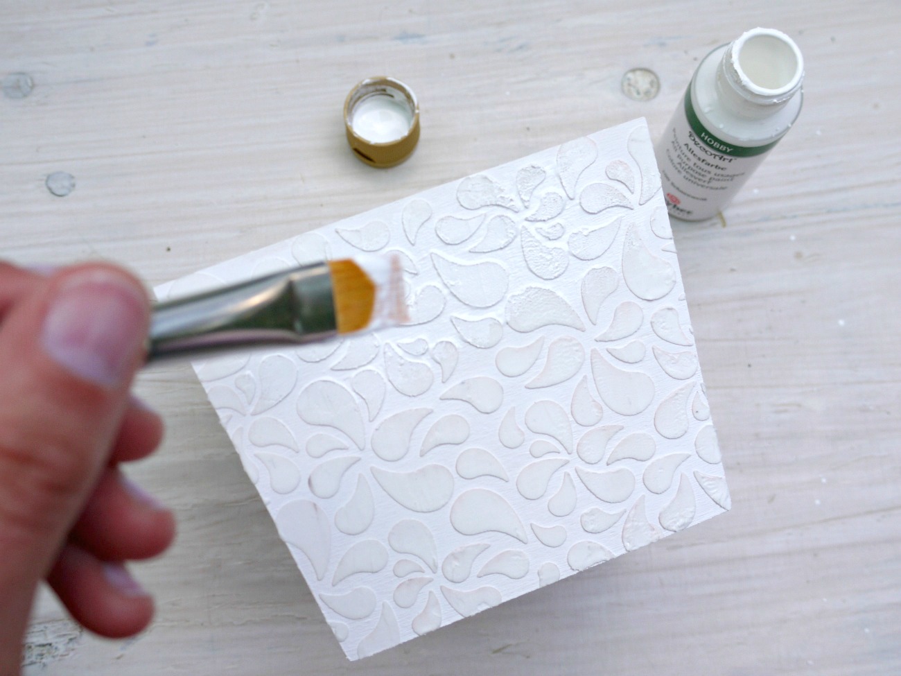 Posodo prebarvamo z belo akrilno barvo in počakamo, da se posuši.