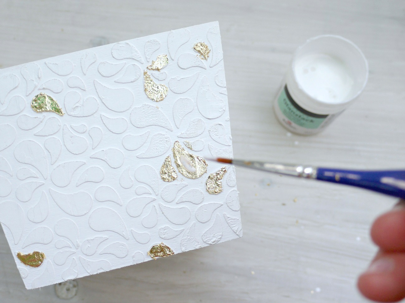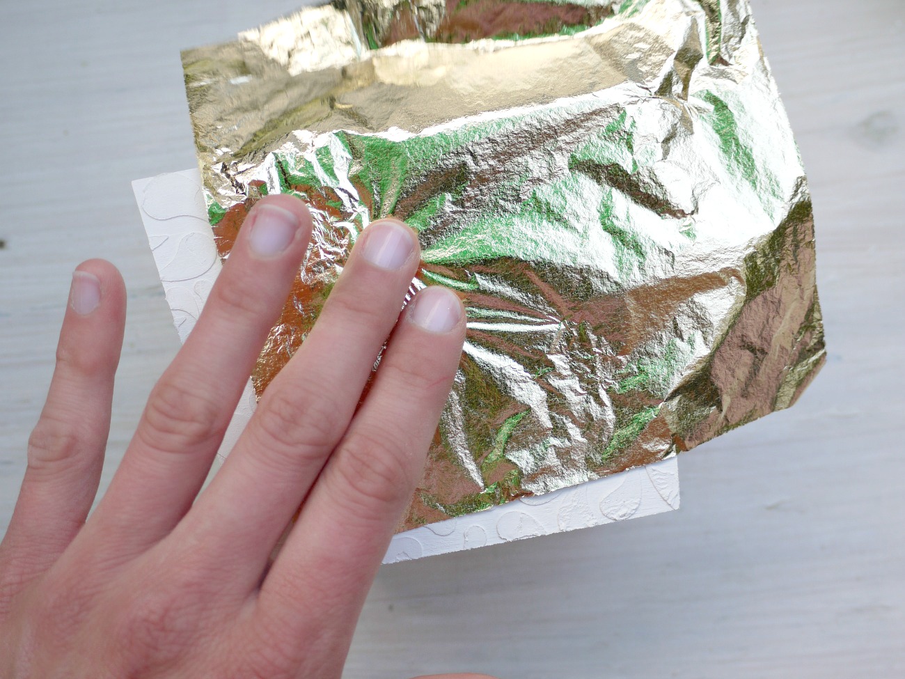 Počakamo približno 20 minut in nato s čopičem previdno odstranimo odvečne kose zlatega lista.